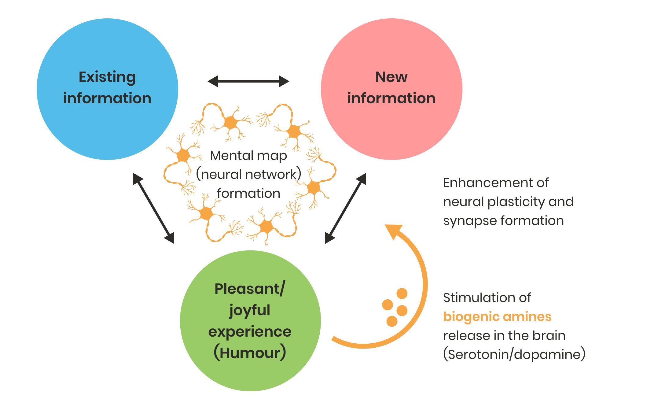 Humour has been shown to stimulate neuronal activities in the human nucleus accumbens [19]. In this region of the brain, fast dopamine fluctuations (in the order of seconds) support learning [20], whereas much slower dopamine changes (in the order of minutes) are involved in motivation [21,22]. Combining these neuroscience findings with the cognitivism learning theory, we developed a working model of how biogenic amines from positive emotions facilitate the formation of a neural network, connecting the (1) existing information, (2) new information, and (3) the pleasant/joyful experience (see figure below). After the formation of this neural network, when a person recalls the memory of any one of the three components, it will lead to neural signals being sent to the other two, which further reinforces the connections (classic Hebbian theory). Through this mechanism, learning and memory can be enhanced.